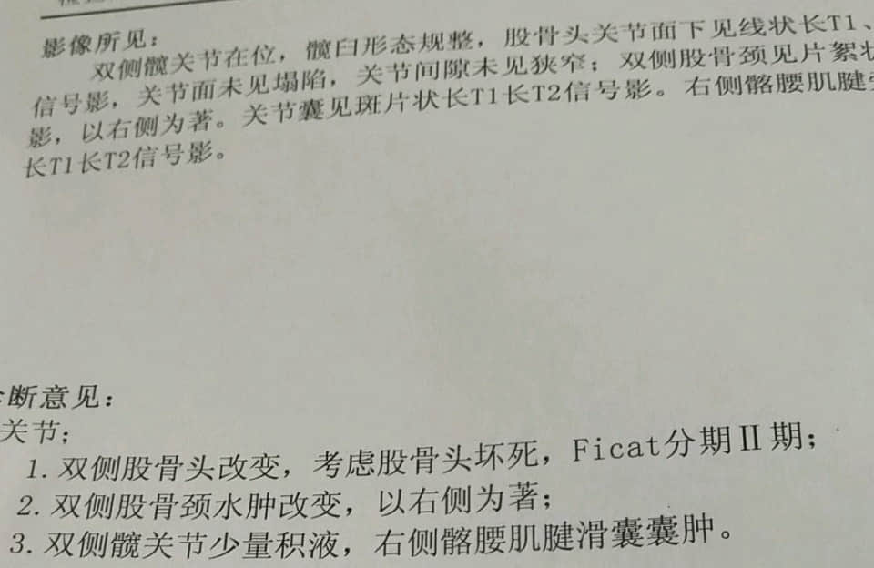 X光片顯示股骨頭的承載系統(tǒng)中的骨小梁結(jié)構(gòu)排列紊亂、斷裂,出現(xiàn)股骨頭邊緣毛糙,臨床上伴有或不伴有局限性輕微疼痛。